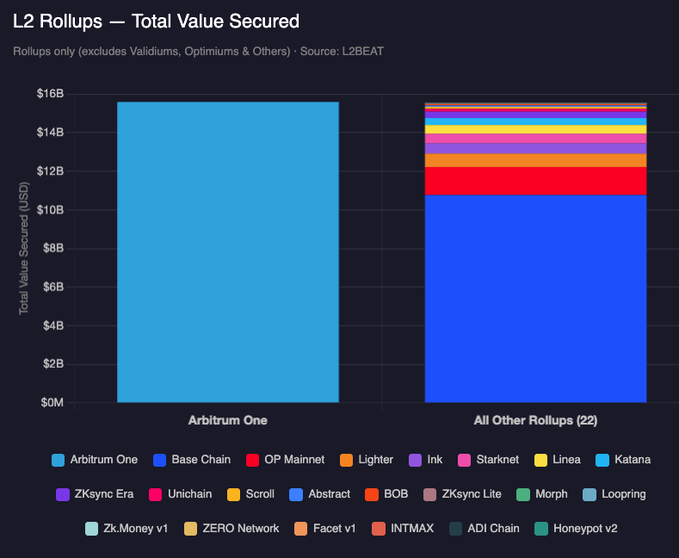 Arb One secures more value than all other Ethereum rollups *combined*, according to @l2beat Its no wonder why teams choose Arbitrum technology as the foundation for their on-chain strategy and expansion Programmable economies are built on @Arbitrum. l2beat.com/scaling/summary