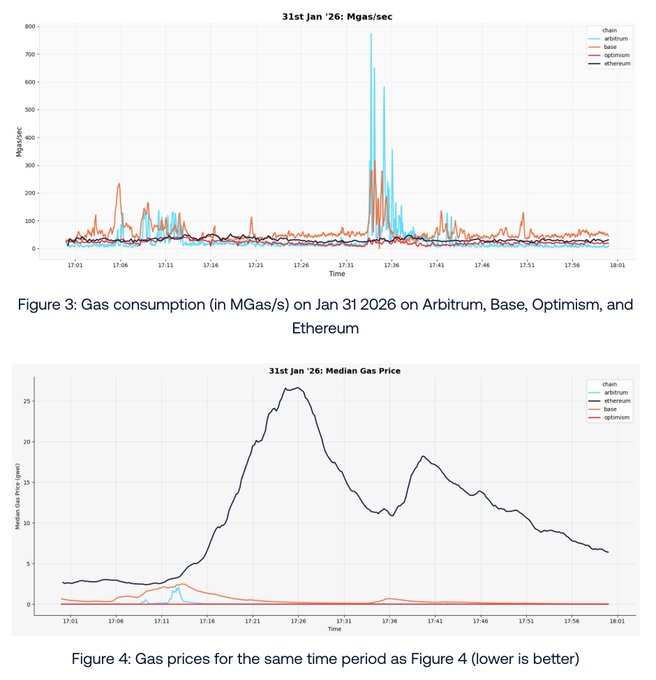 Lower median gas prices with way more demand than Base on Jan 31/26 @arbitrum's scaling approach isn't just "cranking the gas target higher and higher" - it's about smarter gas pricing algorithms & we're shipping multidimensional gas for even more capacity next month 👀 twitter.com/leeederek/status/2...