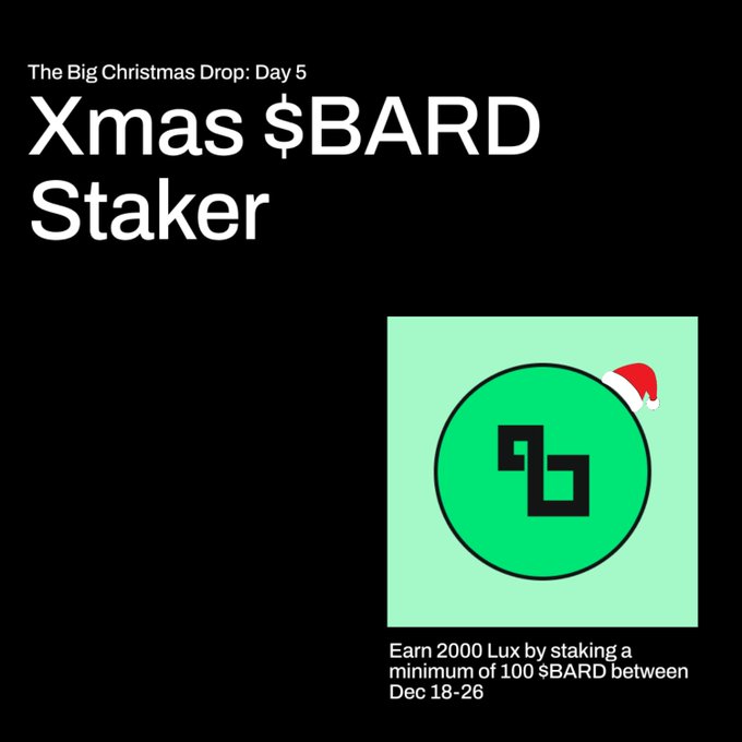 The Big Christmas Drop Day 5: Xmas $BARD staker🎄 Recognising users who stake a minimum of 100 $BARD between Dec 18-26. Eligible users earn 2,000 Lux on top of base rewards. Scroll on for more details.