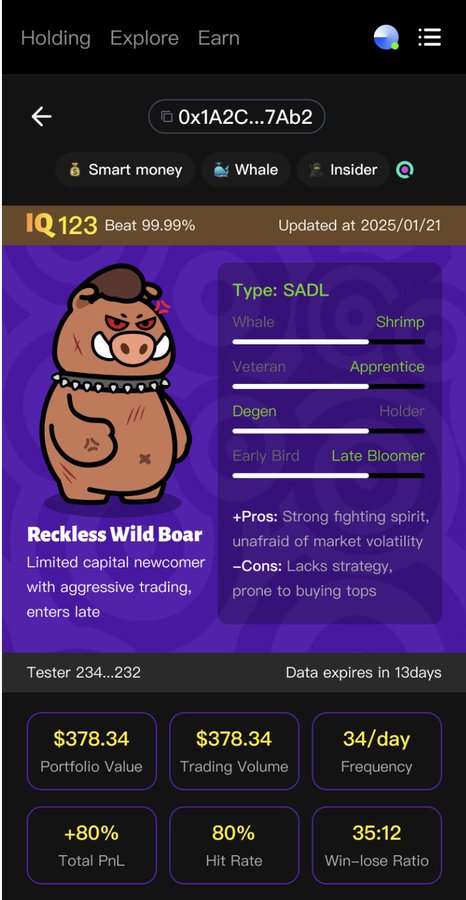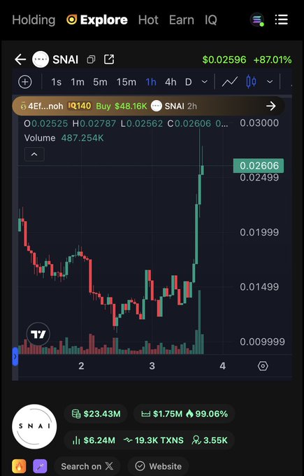 🔹 Wallet E6e...Xar (IQ153.2) missed the price surge, closing position just before the pump. Ape’d in $12K+ in $SNAI 13hrs ago at a $14.76M market cap, then sold all its positions 4hrs ago with slight loss.