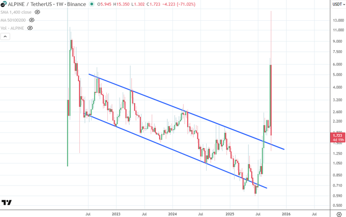 $ALPINE: The craziness continues, it is now back at 1.7 USD, after hitting 15 USD just 12 hours ago. 24hr Futures Trading volume on Binance is at 1.5 billion USD. Absolute madness. twitter.com/ChrisOtt/status/19...