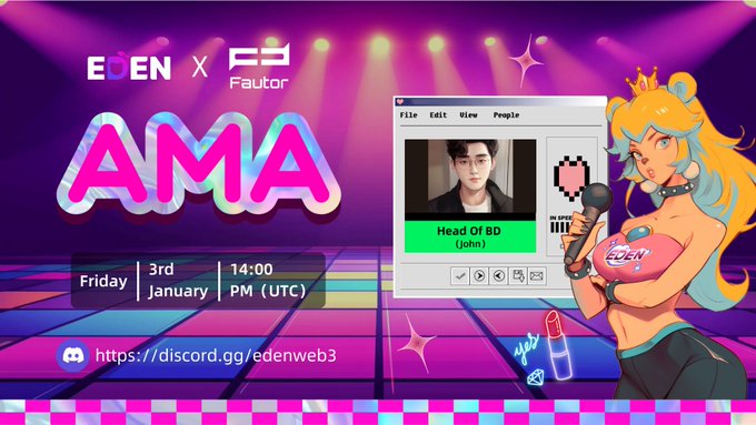 Pillow talk with @fautor_official One of Korean largest (xx) UGC platforms. Date: Jan 3rd Time: 14:00 PM(UTC) http:/discord.gg/edenweb3 You know what xx stands for, xoxo, Eden