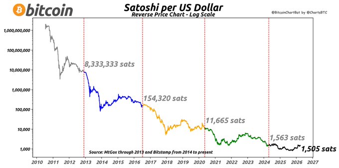 Satoshi per Dollar (Sats/USD) on 2026-04-02: 1,505 sats 1 Bitcoin = $66,433 USD #Bitcoin $BTC #SatsPerDollar #BitcoinChartBot