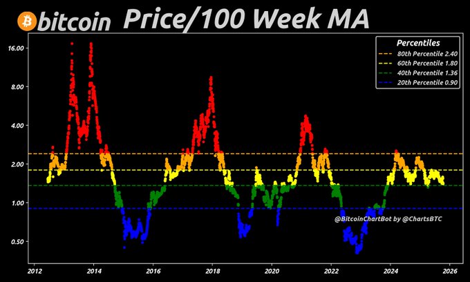 Bitcoin Price: $111,308 100-Week MA: $79,263 Price/100W MA: 1.40 🟡 As of 2025-10-12