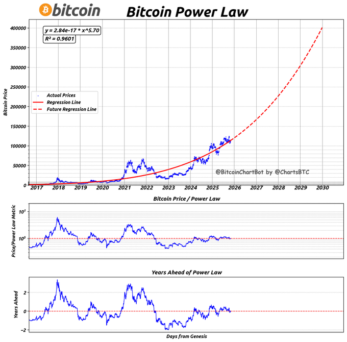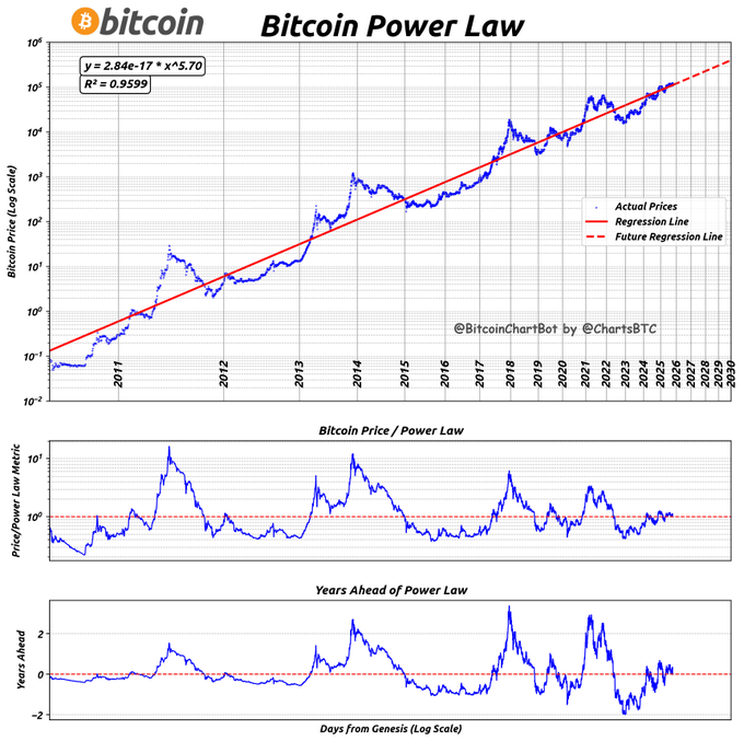 #bitcoin power law Current price is $111,714 Current Power Law price is $111,576 Current price is 0.12% above trend Current price is 1 days ahead trend PowerLaw date for current price: 2025-10-13 #PowerLaw $BTC #BitcoinChartBot