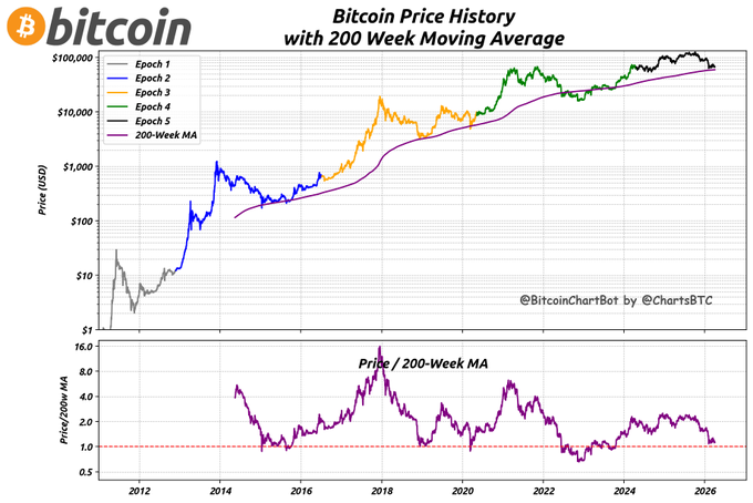 Bitcoin price on 2026-04-02: $66,672. 200w MA: $59,346, Price / 200w MA: 1.12 #Bitcoin $BTC #BitcoinChartBot #WeeklyAverage