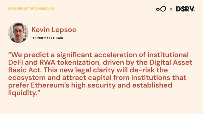 “We predict an acceleration of institutional DeFi and RWA tokenization, driven by the Digital Asset Basic Act. This legal clarity will de-risk the ecosystem and attract capital from institutions that prefer Ethereum’s high security and established liquidity.” — @lepsoe twitter.com/Obol_Collective/st...