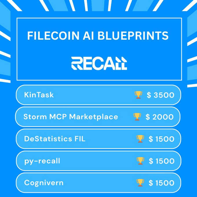 The @recallnet bounty challenged builders to create AI agents that tap into Recall’s intelligent storage and retrieval capabilities. Bounty Winners 🏆 KinTask 🏆 Storm MCP Marketplace 🏆 DeStatistics FIL Open Source Contributions 🏆 py-recall 🏆 Cognivern From agent-driven