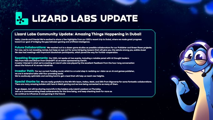 We have seen a lot of not so good updates in web3 gaming lately So I'm happy to share this good one from us as Lizard Labs Some big opportunities and strong new connections. For even more info check in our discord discord.gg/lizardlabs