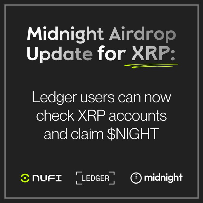 Midnight Airdrop update Ledger HW users can check their XRP accounts' airdrop eligibility and claim $NIGHT using NuFi wallet: 1. create a wallet at http:/nu.fi 2. click Airdrop, connect your Ledger 3. check your XRP accounts & claim $NIGHT ✅ @MidnightNtwrk @Ledger