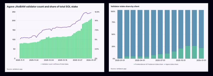 4/ Performance upgrade saw rapid validator adoption Frankendancer by @jump_firedancer grew from 0.78% stake (6 validators) to 25.98% (214 validators). JitoBAM by @jito_sol exceeded 200 validators (12.5% stake) & @doublezero reached 396 validators (39.01% stake) within 3 months.