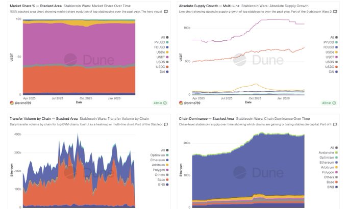 Built a Stablecoin Wars dashboard on @Dune Some things I found digging through $228B of stablecoin data: → USDC grew 7.8% in 30 days, USDS grew 22% → Base now rivals Ethereum on stablecoin transfer volume → USDC on Base turns over 26x/day. For context: USDe on Ethereum: 0.09x Velocity and concentration are the two most underrated metrics in stablecoin research. Most dashboards ignore both. Link below 👇
