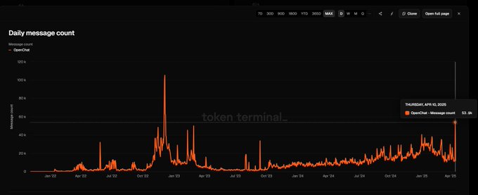 On the 10th of April, we have exchanged more than 53k messages on @Openchat, which is the highest amount of messages exchanged in one day since December 2022📈 Social activity continues to stay elevated on $ICP & $CHAT 📲 Data: @tokenterminal
