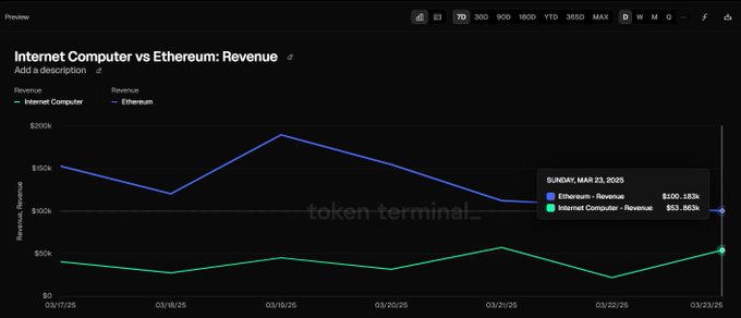 Daily Revenue Comparison💰 $ICP VS $ETH On the 23rd of March ICP did generate $53.8K in Revenue while ETH has generated $100.1K. Basically, ICP is generating more than 50% of the Revenue of ETH at a 85X lower Market Capitalization. Data: @tokenterminal