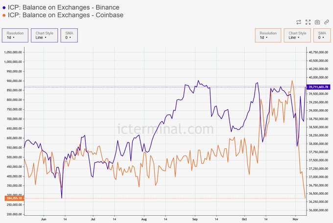 Coinbase has run out of $ICP while Binance keeps topping their Exchange wallet to meet increased demand as the ICP volume 30X-ed in a week📊 Exchanges are currently struggling to keep up with the large increase for demand❌ 44.3% of the total supply is locked and can not be sold on Exchanges 🔐 Only 10.4% of the supply is circulating on Exchanges. As a comparison, the $BTC supply held on Exchanges = 12%📊 Data: @icterminal