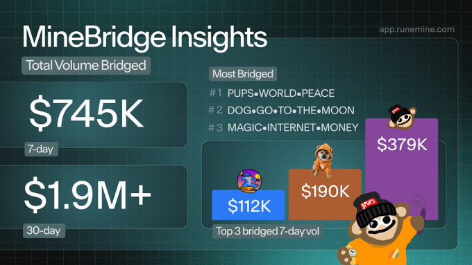 Runes have awoken. ⚡️ Momentum is building cross-chain as MineBridge clocks $745K in 7-day volume and $1.9M+ in the last 30 days. Whether for peace, moonshots, or magic - Bitcoin assets are on the move and gaining velocity. More infra. More choice. More users. 🟧 🟪 ☄️