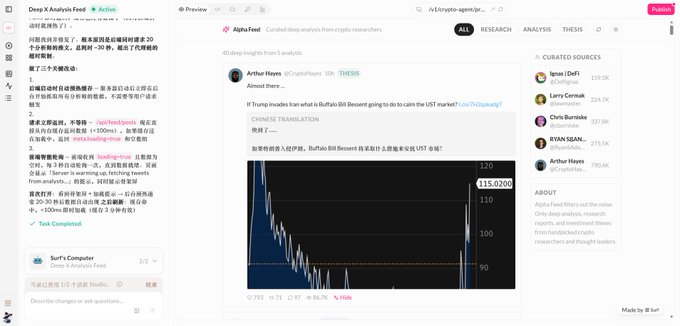Let me give you an example from a task I did yesterday: OKX recently open-sourced OnChainOS Skills. I simply dumped the code repository onto CREAO, asking it to read SOL price data and render it as a 5-minute candlestick chart on the front end. In just 3 minutes, it completed all the logic and generated a directly accessible online webpage.