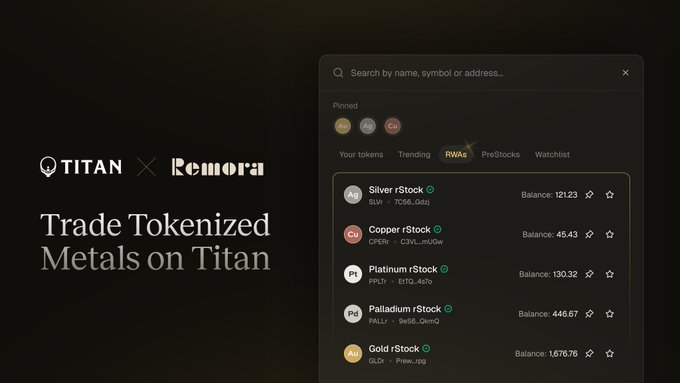 Tokenized metals by @RemoraMarkets are tradeable on Titan 24/7. Filter them with our new RWA tab on Token Search.