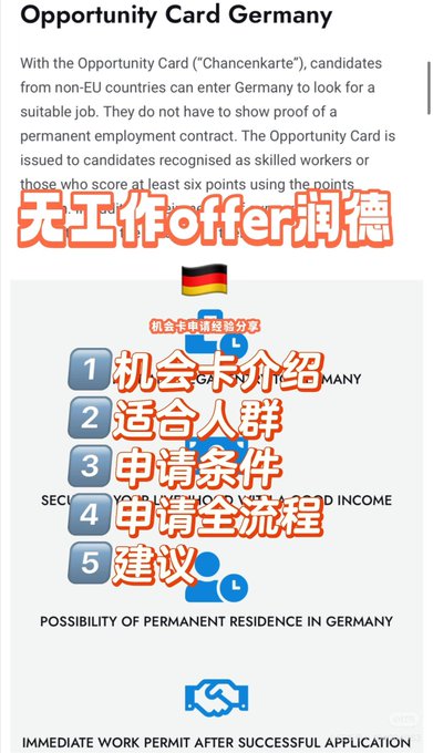 [Germany Opportunity Card Complete Guide] Go to Germany Without a Job Offer Many people have asked me about the visa I used to enter Germany. Finally, here's my guide to applying for the German Opportunity Card! I'll explain everything clearly in one article! Purely practical information, highly recommended to save! ⭐️ I. What is the German Opportunity Card? 👉 Simply put: Germany's "job-seeking pass" for foreigners! You don't need to find a job first; as long as you have enough points (more on points later), you can apply. You can legally come to Germany to find work/intern for one year, and once you find a job, you can directly switch to a work visa! 👉 Official website introduction: chancenkarte.com/de II. Who is suitable to apply for the Opportunity Card? 1️⃣ Young beginners: Those under 35 years old receive more points. 2️⃣ Highly educated individuals: Bachelor's/Master's degree. 3️⃣ Strong German/English speakers: B1 German or B2 English. 4️⃣ Prior German experience: Study/work experience is a plus. 5️⃣ In-demand industries: IT, nursing, engineering, etc. (Extra points!) III. Application Requirements: Detailed Explanation of the Points System (Figures 2-3) 🔑 Must meet: Language: German A1 or English B2 Education: Two years of vocational training or a university degree Deposit: At least €12,000 in deposit (approximately RMB 95,000) (Those with lower deposits can apply for a six-month opportunity card) 📈 Bonus Points (6 points required; you can test your score on the official website) Age ≤ 35 (+2 points) German Language B2 (+3 points) Live in Germany for at least six months within the last 5 years (+1 point) In-demand occupation (+1 point) 2 years of work experience (+2 points) IV. Application Process 1️⃣ Required Documents: Passport Educational Certificate (Non-German qualifications require Anabin certification) Language Certificate (Goethe/IELTS, etc.) Bank Statement – Frozen account for self-funding Resume – German or English acceptable Motivation Letter – Explaining your job search plan (ideally, also include emails confirming you've submitted your resume/interview invitations) Proof of Residence in Germany – Hotel/Airbnb/Rental Contract/Invitation Letter from a Friend (I had a friend issue the invitation letter, attaching their rental contract and passport) Medical Insurance Certificate (Some self-funding companies offer a complete visa application insurance package; I bought a package for convenience) Appointment Confirmation (Important! No appointment, no chance of admission) 2️⃣ Online Application: Register through the German Federal Immigration and Naturalisation Service (BND) website's Opportunity Card channel (digital.diplo.de/chancenkarte)→). Fill out the form → Upload materials → Wait for review (currently, the waiting time in Shanghai is approximately 2-8 weeks). 3️⃣ Visa Interview: After the review, schedule an interview (time is uncertain; I waited about a month before). Submit your application in person (it took another month from application to visa approval). V. My Advice💡 1️⃣ If you didn't graduate from a German university, please get your academic credentials verified at least 3 months in advance! 2️⃣ German A1 level is the minimum, but B1 or higher makes it easier to find a job. Learning German while applying will greatly enhance your competitiveness💹 3️⃣ Contact German job seekers/LinkedIn in advance to find opportunities. 4️⃣ Don't falsify information! Germans are extremely thorough in their verification process.