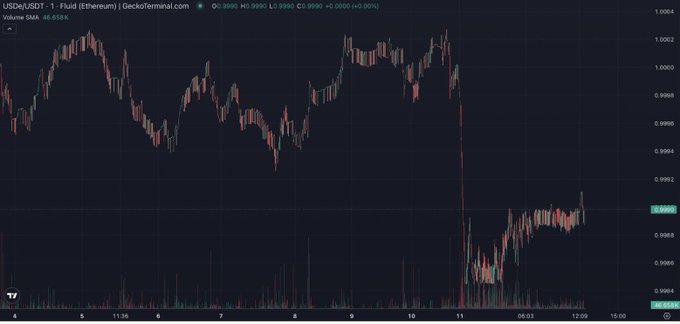 4/ Onchain, the picture was very different. Across major DEX pools, USDe’s peg stayed tight, bottoming around $0.99, even with a 10-15% volume compared to CEX.