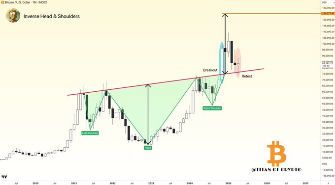 Bitcoin has successfully retested the neckline of its inverse head and shoulders pattern, a classic bullish setup. If this structure continues to hold, there's a strong probability $BTC makes a run toward $125,000 in 2025. (Source: Washigorira)