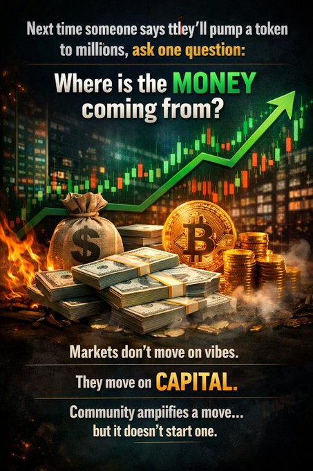 The core truth of every market is that money moves markets. Next time someone says they are going to pump a token to millions, ask them if they actually have the capital to do it. Let’s be realistic, it takes serious money to move a token to 100M Tokens don’t pump just because of the community. They pump because someone behind the scenes is willing to take the financial risk to drive momentum and attract whales and retail buyers. Adios!