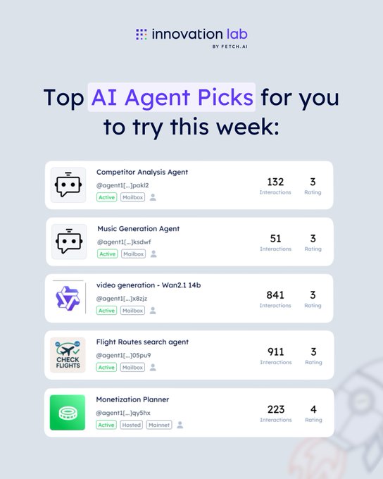Here’s a roundup of the most useful AI Agents on http:/Agentverse.ai you should try this week 👀 With over 2.6M agents already deployed on http:/Agentverse.ai, we review the marketplace regularly to share some cool (and very useful) uploads with you 👇 @WSana81 @Fetch_ai