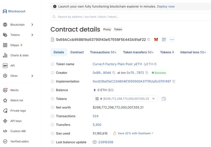 🚨 DeFi Forensics: The Yearn yETH Exploit On Nov 30, 2025, an attacker drained ~$3M from @yearnfi’s yETH pool by minting “infinite yETH” We’ll show you how to reconstruct the entire attack using Blockscout, the open-source blockchain explorer The main entities in play: ⚖️ yETH Pool (on Balancer) eth.blockscout.com/address/0x6...… 💥 Exploit Transaction eth.blockscout.com/tx/0x53fe7e...… 🧠 Attacker’s Contract Creator eth.blockscout.com/address/0xF...… 💰 Loot Wallet eth.blockscout.com/address/0x3...… --- Let’s investigate 👇