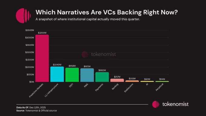 Which Narratives Are VCs Backing Right Now? With ICOs and token launches picking up again, it’s becoming clearer where fresh VC money is actually flowing. the funding activity from the past three months across different sectors to show what investors are focusing on in this market. Funding concentration is shifting — Prediction Markets, RWA, and Defi dominate Q4, while AI cools off and Perpetuals see minimal allocation despite strong market performance from $HYPE $ASTER & LIGHTER. Sector Allocation Overview Based on deals >$10M from the latest funding dataset. • Betting / Prediction Markets – ~$3.2B+ (Polymarket + Kalshi inflate category) • L1 / Infrastructure – ~$1.04B+ • DeFi – ~$958M+ • RWA – ~$920.7M+ • Payments – ~$660M+ • Banking – ~$217.5M+ • Stablecoins – ~$102M+ • AI – ~$60.8M+ • Trading/Perpetual - ~$54.4M+ • Depin - ~$43M+