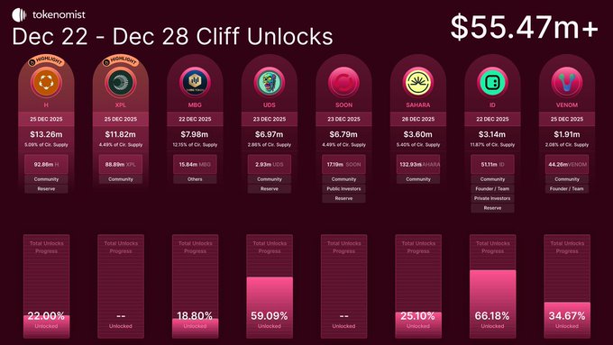 🔓 This Week Cliff Unlocks: Dec 22 - Dec 28, 2025 🔥 $55.47M+ 🔥 ⭐️ Unlock Highlights ⭐️ $H (5.09%) - $13.26M $XPL (4.49%) - $11.82M $MBG (12.15%) - $7.98M $UDS (2.86%) - $6.97M $SOON (4.49%) - $6.79M $SAHARA (5.40%) - $3.60M $ID (11.87%) - $3.14M $VENOM (2.08%) - $1.91M