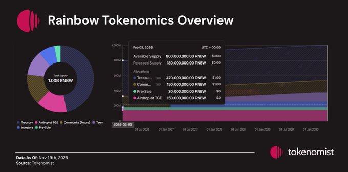 1/ Rainbow $RNBW Tokenomics snapshot 👇 • Total supply: 1B | Initial float: 18% • TGE: Feb 5 | Sale price: $0.10 • Allocation: Treasury 47% | Airdrop 15% | Community 15% | Team 12.2% | Investors 7.8% | Pre-sale 3% • Vesting: 1Y cliff + 3Y linear for insiders • Funding: $21M Revenue flywheel: protocol fees → $RNBW buybacks → redistributed to users. Low float + revenue-backed buybacks define the setup.