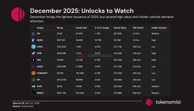 🚨December is the lowest emission month of 2025, but several key unlocks stand out: • $HYPE leads the month in dollar value with a $333M unlock — the largest December release. • $EIGEN, $STRK, $ZRO, and $KMNO carry high insider emissions, making them the ones to keep a closer eye on. • $SUI remains notable due to size and ecosystem activity, even with moderate insider allocation. • The rest of the month is filled with small, low-pressure emissions across $LINEA, $SOON, $XPL, $KMNO, and $H See Full Dashboard : tokenomist.ai/?preset=default-...…