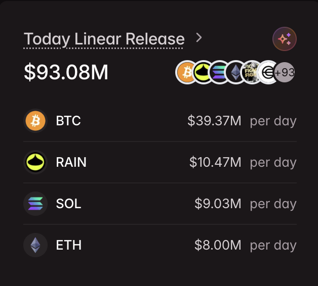 $RAIN just jumped to #2 in daily unlocks at $10.47M/day 👀 For context: it's now ahead of $SOL ($9.03M) and $ETH ($8.00M) 1-year inflation: +156.76% of circulating supply Notable to see a smaller-cap token with unlock velocity comparable to major L1s 📊