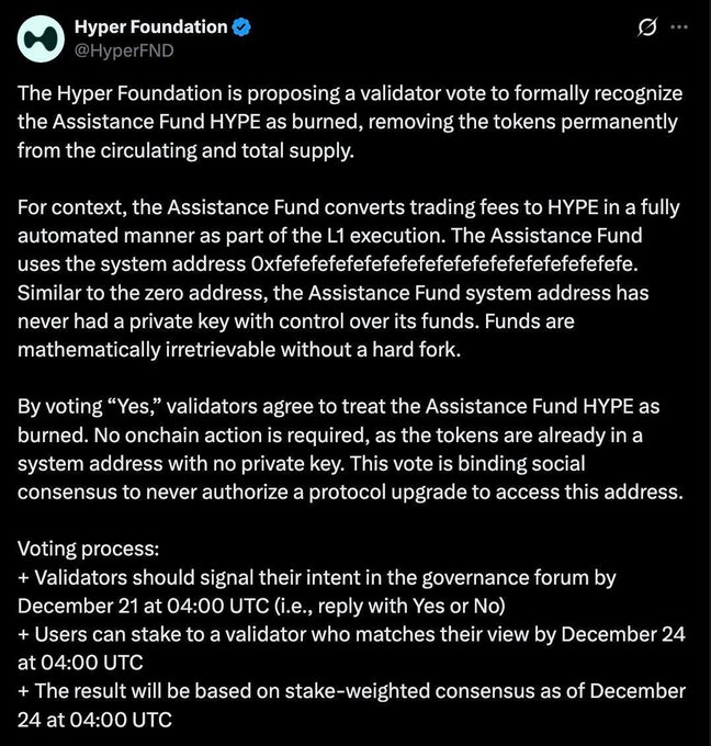 🚨$HYPE Supply Update🚨 @HyperFND has proposed a validator vote to officially recognize the Assistance Fund $HYPE as burned The address holds 37 million HYPE. If approved, these tokens will be treated as burned, reducing circulating supply by ~11%. The final decision will be made through stake-weighted consensus, with voting concluding on Dec 24.