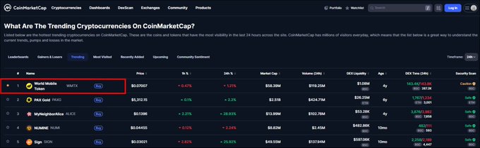 We are currently the number ONE trending token on @CoinMarketCap over the last 24 hours ⚡️ World Mobile Token is leading the takeover. 🏆1⃣ $WMTx is the ticker.