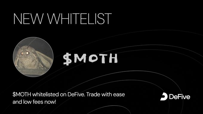 💡 $MOTH found the lamp. @mothvslamp is now whitelisted on DeFive! 🎁 The first 50 liquidity providers will receive an exclusive, fresh Wiggy NFT! Details coming soon. 🪙 Add liquidity now & farm the light: defive.com/pools 🦟 Trade $MOTH: defive.com/swap?outputCurrency...…