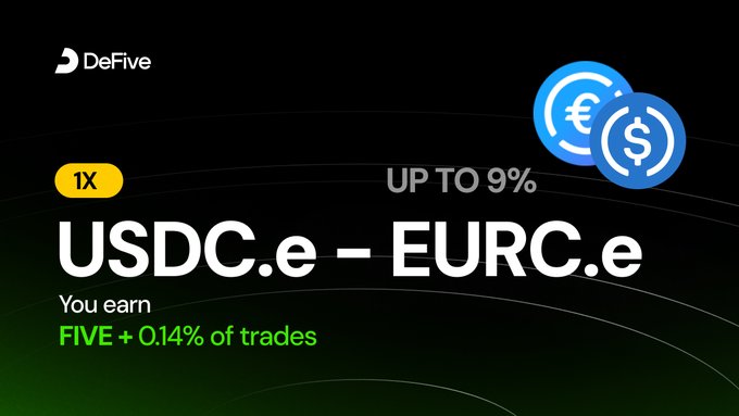 👀 Native @USDC is coming to @SonicLabs — but why wait to earn? Farm EURC.e/USDC.e today and pocket a clean 9% APR while riding stable to stable. Steady $FIVE gains while the ecosystem upgrades. 🧃 Add liquidity: defive.com/pools