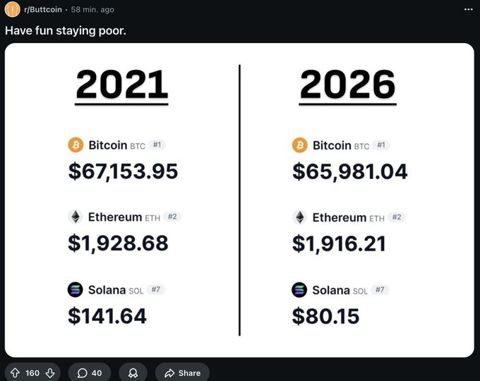This is why you should pay attention to narratives and meta plays within these ecosystems Yes ETH price is literally the same five years later BUT you could multiply your ETH holdings by trading NFTs, buying AI tokens early, getting into Virtuals and lots of other DeFi opportunities. Same with Solana, NFTs, memes, ecosystem airdrops etc. So yes avg crypto holder is not happy about the price action, but if youre in the CT, youre above avg crypto holder and you have more edge than all other crypto participatians Use it.