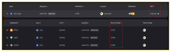 Although market sentiment isn't great today, here's what we have: ore with an APY between 100% and 200%. Lista recently launched a new Aster section, and the first Vault is currently offering a large subsidy with a high APY! It seems that Lista is preparing to make a big push to develop on-chain deposit and wealth management. ⚒️ The general idea and process are as follows: 1️⃣ Lista's Aster zone offers incentives for CDL members, with current deposit APY reaching over 440%. 2️⃣ If you happen to be a CDL holder, you can directly deposit funds to enjoy an extremely high APY. 3️⃣ However, most miners have a low risk tolerance, so borrowing or hedging is often a safer option. 4️⃣ Unfortunately, neither Binance nor Aster offers CDL contracts, so hedging strategies are not an option. 5️⃣ Fortunately, Lista itself supports borrowing CDL by staking USDT, BTC, and Aster, with an annualized interest rate of less than 1%. 6️⃣ So the idea is simple: borrow it out and then deposit it back in. 🤔 At this point, some people may wonder: since the APY of deposits is as high as 440%, why did we only mention 100%-200% at the beginning? The reason is that CDL's liquidation threshold is 50%. Based on this ratio, the cost of funds will naturally be discounted, and CDL is not a stablecoin, so leaving a safety margin is necessary. For example, if you only mortgage 30%, then the actual APY will be reduced by 30%. Therefore, this mine is more suitable for small investors, and large investors are unlikely to participate. Beyond the mining itself, considering the current state of BNB Chain, especially the fact that Aster was shill by CZ yesterday, it may need to be understood within a broader context. There's a popular saying lately: Aster is "Binance on the blockchain." However, those who frequently use the Binance app know that the app has a wealth of features, which clearly cannot be handled by a single protocol like Aster. The financial incentives launched by Lista this time are essentially still based on the concept of "Binance on the blockchain". What it aims to serve is likely the wealth management section within the Binance App. In other words, Aster is merely the leader of the "Binance on Chain" in the larger context, while the specific business still needs to be distributed across various protocols of the BNB Chain. For details, please refer to YZi Labs' description of the BNB ecosystem in their tweet the day before yesterday. @lista_dao is the only project mentioned twice. YZi's tweet: x.com/yzilabs/status/198352804...… Attached is a previous analysis of Binance's wealth management module: x.com/BitHappyX/status/1846750...… Perhaps, as "Binance on the blockchain" gradually takes shape, Lista will also gradually evolve into an on-chain "Binance Wealth Management" platform. Note: The above is for informational purposes only and does not constitute investment advice. Please conduct your own research! Lista's coin holder: BitHappy twitter.com/BitHappyX/status/1...