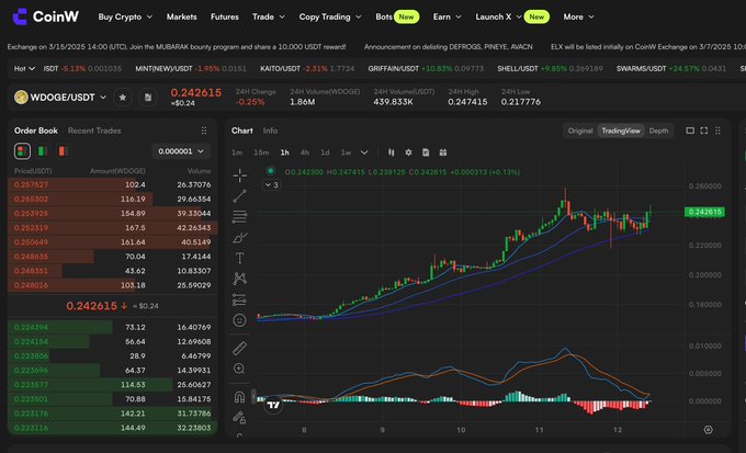 $WDOGE is the cornerstone of the Doge Cardinals protocol and has been rising in tandem with $DOGE. #Cardinals #WDOGE #DOGE coinw.com/spot/wdogeusdt