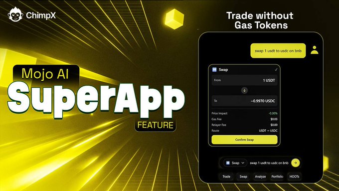 Day 1 of What Your SuperApp Can Do on #BNB ⚡ Trade without GAS TOKENS by just chatting. Ex. - 💬 Hey Mojo, swap 1 BNB for USDT That’s it. Mojo handles the rest. Best Rates, Fastest Execution & Lowest Fee. Welcome to the future of trading on @BNBChain.