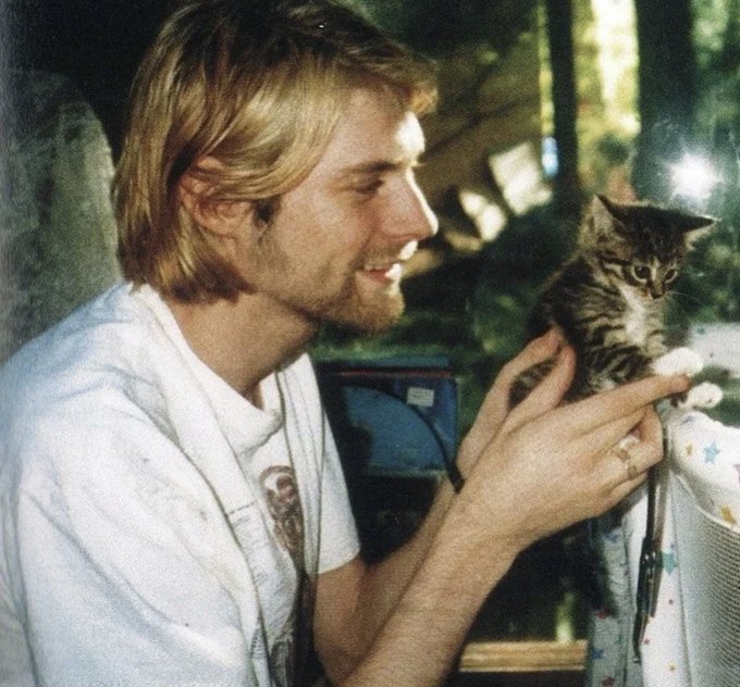 Kurt Cobain introducing Francis Bean to their new kitten, Spina Bifida, 1993