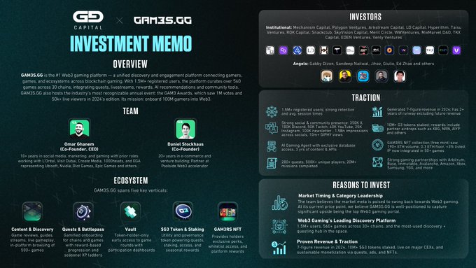 We’re excited to share another strategic investment by GG Capital — http:/GAM3S.GG. The DAO has acquired $G3, the native token powering the GAM3S ecosystem. @GAM3Sgg_ @yoitsOG 📄 Investment memo below: