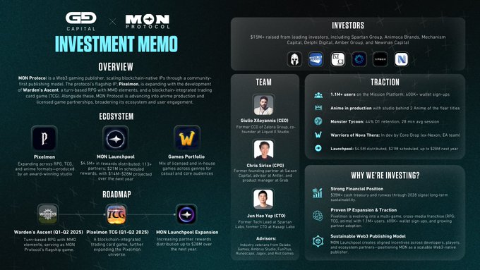We’re excited to share another strategic investment by GG Capital — MON Protocol. The DAO has acquired $MON, the native token powering the MON ecosystem. @monprotocol @Pixelmon 📄 Investment memo below: