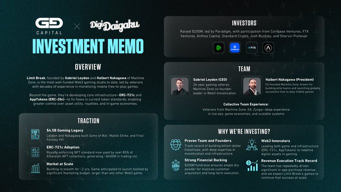 We’re excited to announce our second investment in GG Capital, the DigiDaigaku ecosystem. The DAO has purchased 1 Genesis NFT, 2 Giant Dragons, 1 Hero, 1 Super Villains and 5 Baby Dragons. @DigiDaigaku @LimitBreak 📄 Investment memo below: