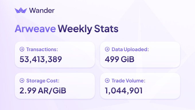 Arweave Weekly Stats (Dec 8–14) New milestone: 24B+ total transactions! Weekly Stats - 53.4M Transactions: - 499 GiB Uploaded - 1M+ AR Trade Volume Network Totals - 24B Transactions - 304,419 Wallets - 341 TiB Weave Size