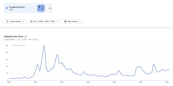 Search interest in crypto actually doesn't look bad on a longer time frame. Take out the anomaly that was 2021 and it's been steadily growing over multiple years.