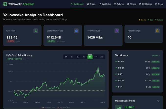 I've been cooking a site with uranium market info and analytics. So far, it: * Parses SEC filings to pull reserves for miners * Summarizes SEC filings * Aggregates uranium and nuclear news * Displays reserves, price, financials and filings by miner Let me know what you think.