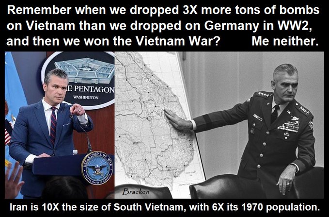 I'm getting a strong feeling of déjà vu with Sec War Hegseth's daily repetition of of our record-breaking bombing raid sortie numbers. We've seen this movie before. It does not have a happy ending. 🧵 Tell us when the Strait of Hormuz is open to shipping at pre-28-Feb sneak attack levels. Until then, even if we level every Iranian city, WE ARE LOSING. And the entire world sees it, and blames us for the global economic wreckage.