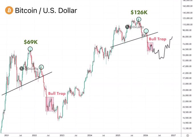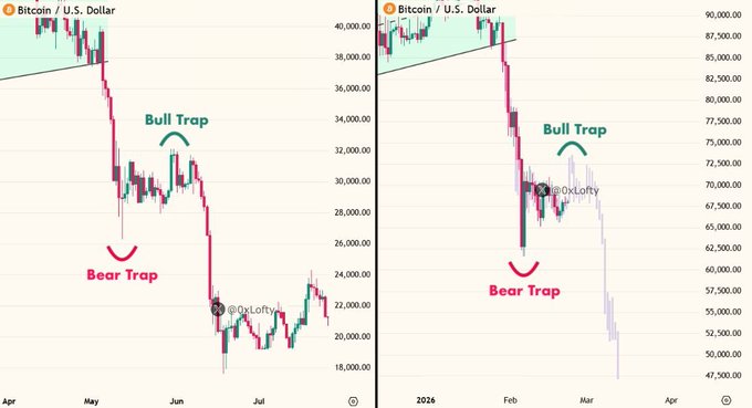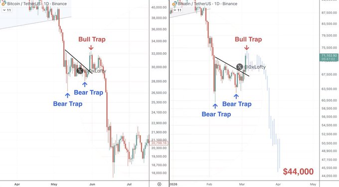 Bitcoin is mirroring the 2022 pattern right now. The final Bull Trap is over, and $BTC is preparing for another dump. $60K → $74K → $44K